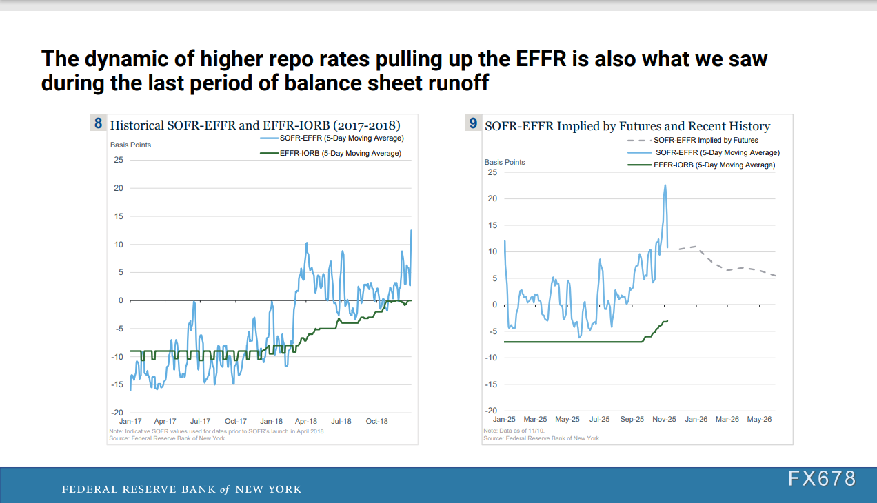 回购利率走高拉动有效联邦基金利率(EFFR)的这种动态,也是我们在上一轮资产负债表缩表期间所观察到的情况